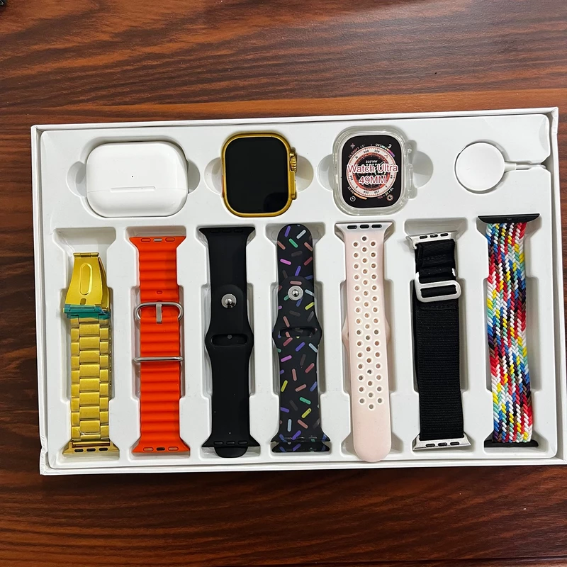 • اقلام همراه: ۷ ست کامل بند (یک عدد فلزی، ۴ عدد سلیکونی، ۲ عدد پارچه‌ای)، ایرپاد پرو ۲، گارد محافظ شفاف ساعت، وایرلس شارژ ساعت